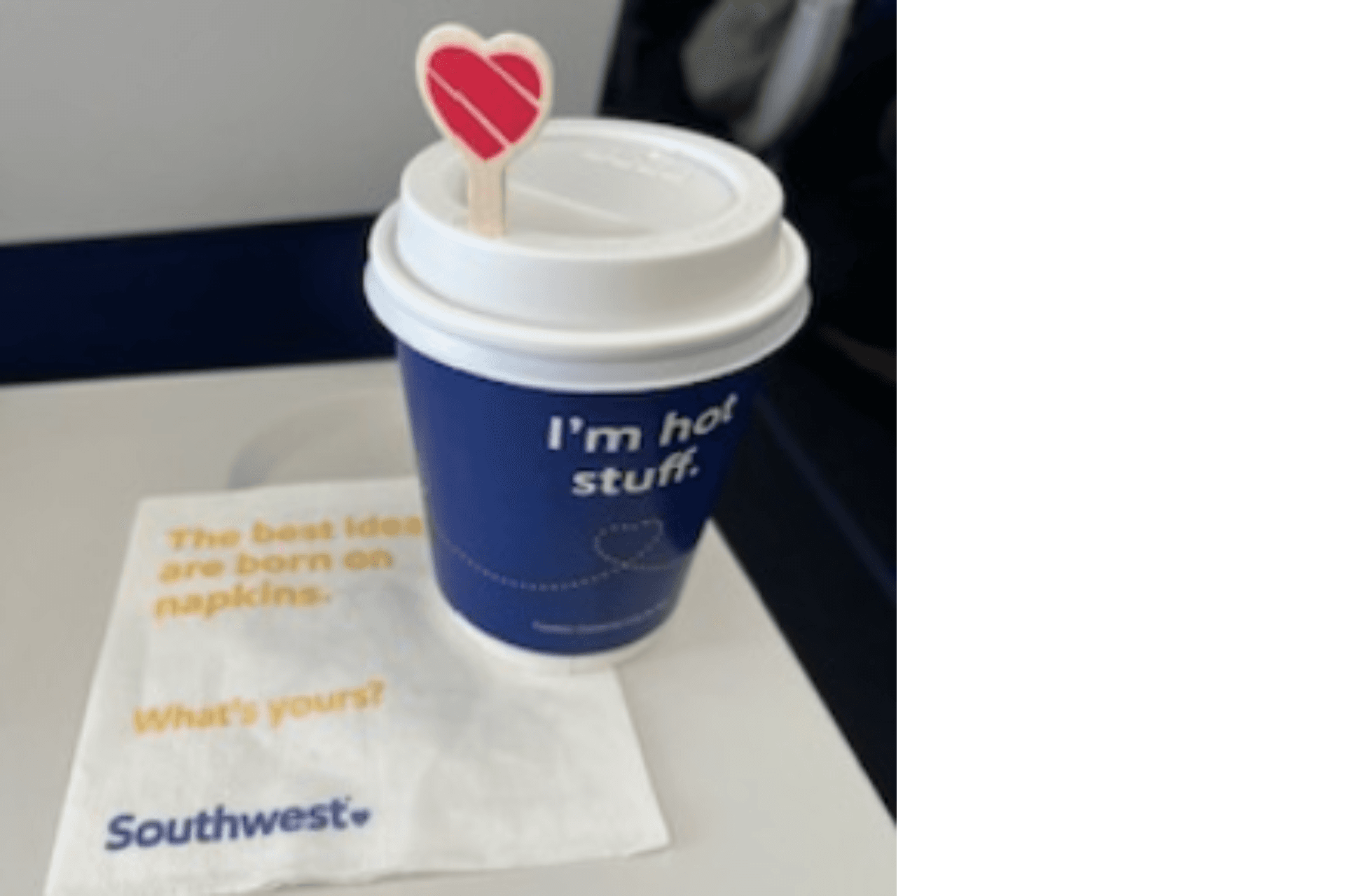 On the flight from RDU to STL, the Southwest Airlines flight attendant handed me a coffee with a heart-shaped stirrer and a napkin that said, “The best ideas are born on napkins. What’s yours?”