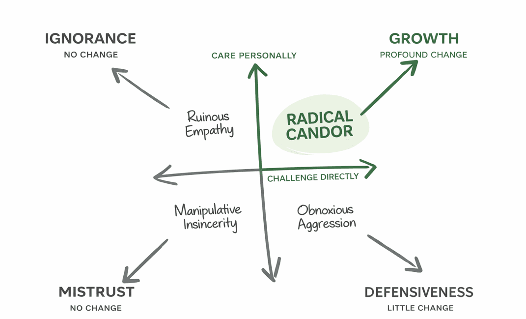 If you’re familiar with Kim Scott’s Radical Candor framework, you’ll recognize the four quadrants that balance care personally with challenge directly.