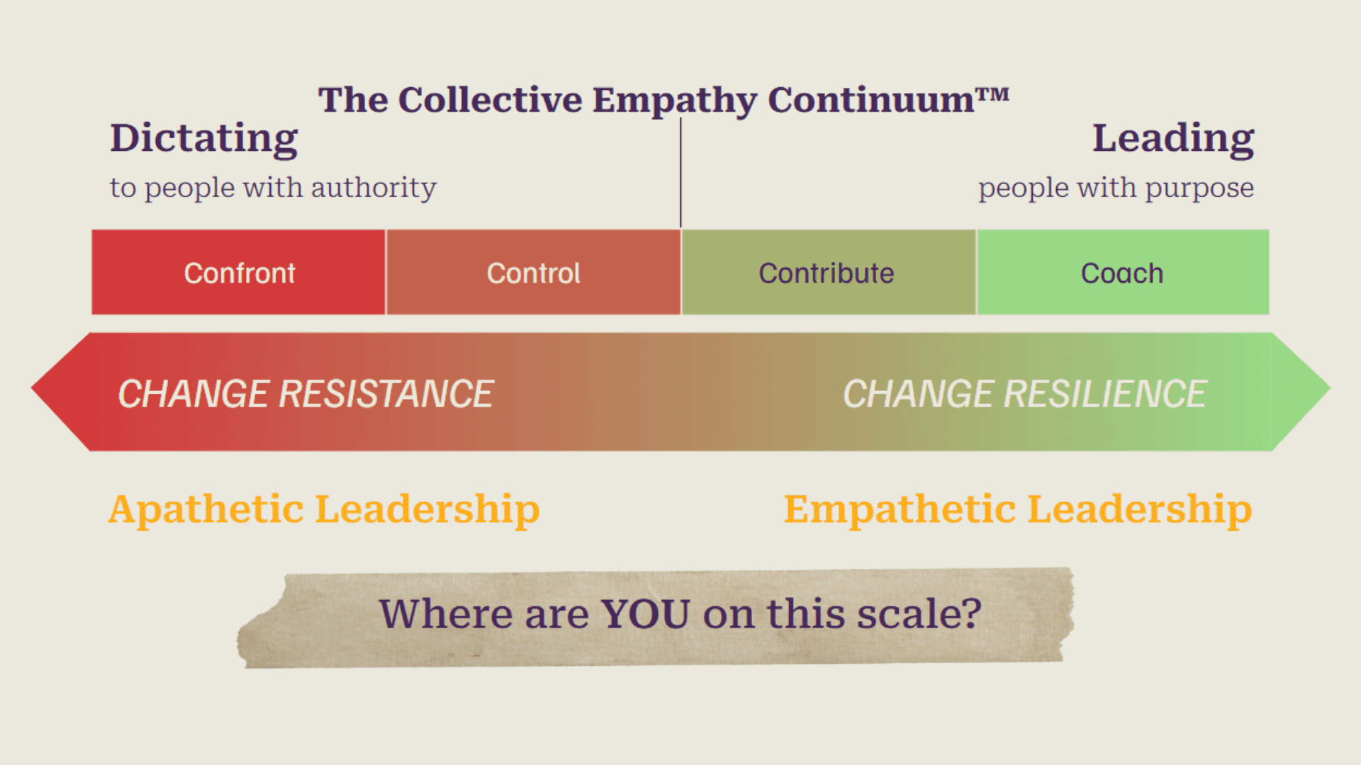 Think of collective empathy as a spectrum. On one end, we have apathetic organizations that dictate the change to people with authority, focusing on control and confrontation. On the other end, we have empathetic organizations that “lead people through change with purpose,” prioritizing collaboration and coaching.